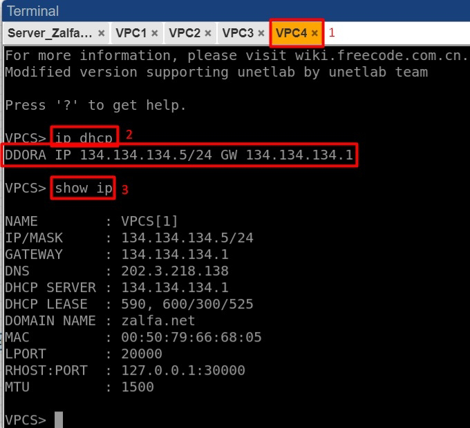 26. Memulai melakukan request IP pada setiap masing-masing PC client kepada DHCP Server dengan cara double klik dibagian salah satu PC client kemudian ketikkan perintah (ip dhcp) perintah tersebut digunakan untuk meminta atau merequest IP Address secara otomatis. Jika saat proses requsest terdapat status (DORA) maka sudah dipastikan bahwa client akan mendapatkan ip secara otomatis, jadi status DORA ini merupakan tahap kerja dari DHCP Server dengan Clinet : D (yang berarti Discover), O (yanng berarti Offer), R (yang berarti Request), dan A (yang berarti Acknowledge). Jadi dapat disimpulkan jika client melakukan proses request pastikan status harus DORA yang artinya antara client dengan server terhubung satu sama lain. IP yang akan di terima oleh client merupakan IP yang terdapat yang berada dalam jaringan ethernet 2, dengan IP dari setiap client menerima range ip ethernet 2. Kita juga dapat mengetikkan perintah (show ip) yang dimana perintah tersebut akan menampilkan IP subnet client yang didapatkan oleh server. IP Yang didapatkan dari client juga harus sesuai dengan IP dari konfigurasi subnet interface ethernet 2 yang telah kita buat sebelumnya pada file dhcpd.conf.